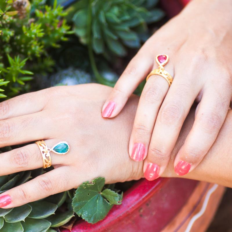 Magnífico anillo de filigranas bañado en oro 22K y completamente ajustable, con una lágrima de cristal verde facetada que capta la luz y cambia según su intensidad.