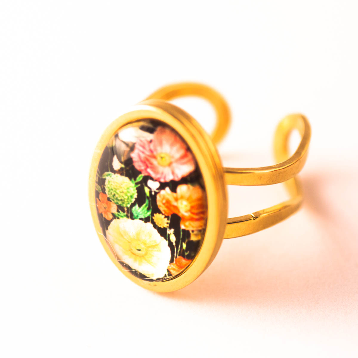 Anillo de cristal con unos dibujos de flores antiguos y acero inoxidable bañado en oro totalmente ajustable.