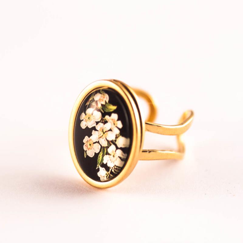 Anillo de cristal con unos dibujos de hojas en blanco y negro y acero inoxidable bañado en oro totalmente ajustable.