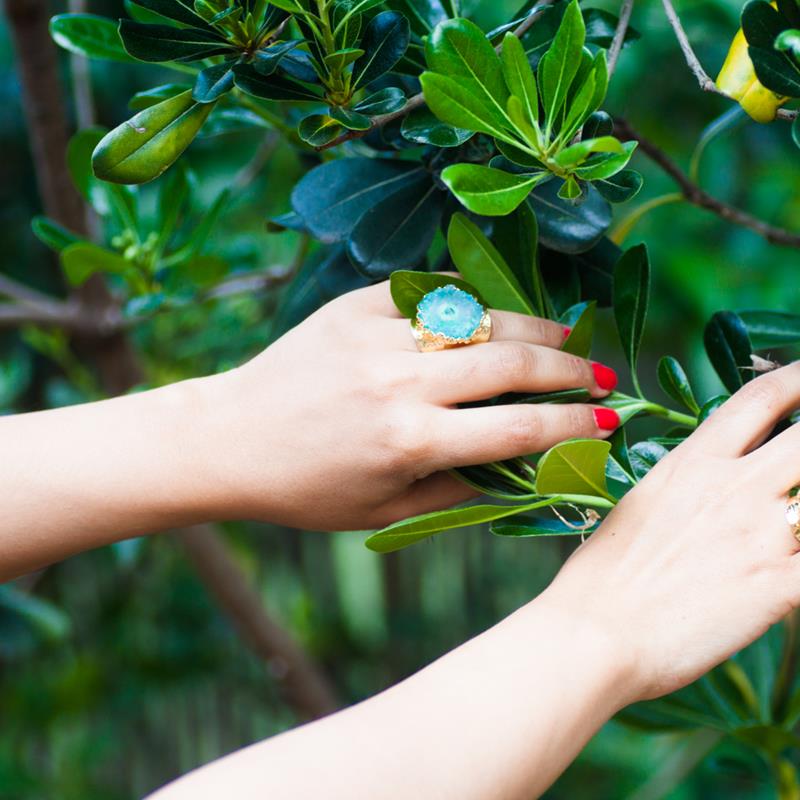 Anillo ajustable de piedra de cuarzo de unso 25mm aprox, y base de bronce bañada en oro 24K. Cada piedra es diferente ya que son naturales y teñidas a mano, no hay ninguna igual, por lo que variará con la fotografía.