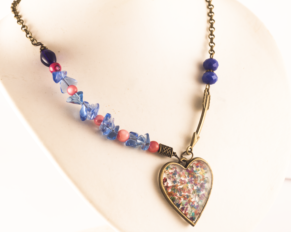Corazón de 3.2x3 cm de resina y en su interior flores secas, borde de bronce. Flecha en bronce y cristal en chips y ojos de gato, cadena redonda en color bronce.