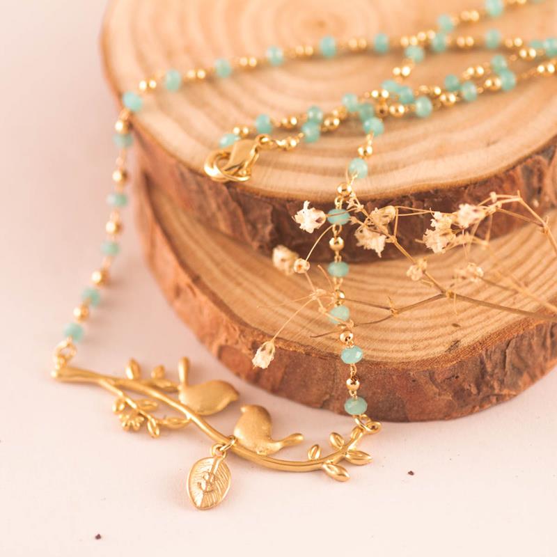 Precioso y fino collar hecho con una pieza central con una pareja de pájaros sobre una rama y colgando una pequeña hoja con la inicial grabada ( no pintada, solo grabada así que la definición no es muy marcada, tenlo en cuenta) , todo ello en baño de 18K Oro Mate, cadena de alambre bañada en oro 24K y cristal de alta calidad facetado en azul claro.