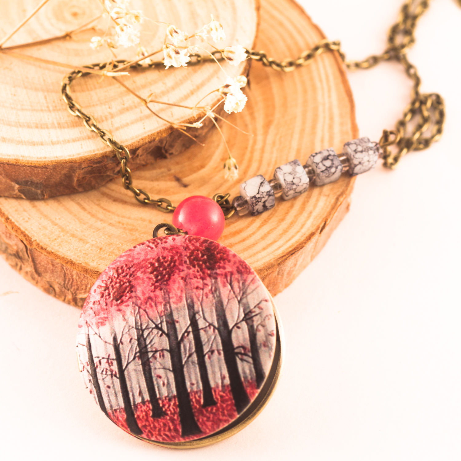 Collar Medallón de latón color bronce por detrás y pintado en relieve un precioso dibujo de árboles que se abre para poder introducir fotos, recuerdos, etc. Cuentas de cristal y cadena color bronce. Diseño exclusivo, muy pocas unidades disponibles, llevarás algo único y especial.