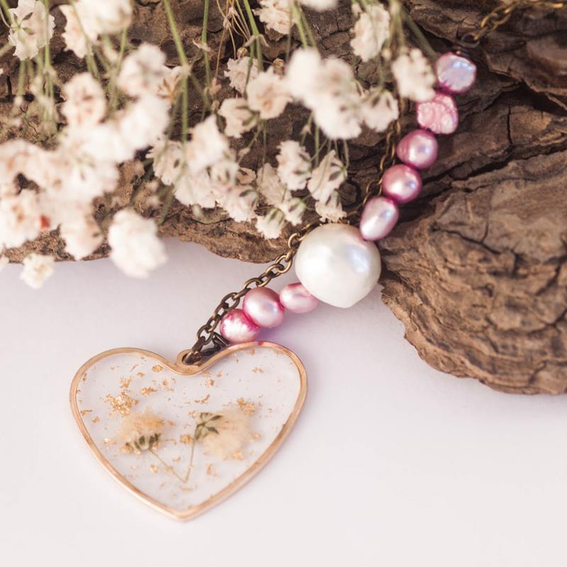 Collar con una pieza central en forma de corazón, de una fina capa de resina y con flores reales blancas en su interior, perlas reales de agua dulce en rosa y blanco y cadena de color bronce.