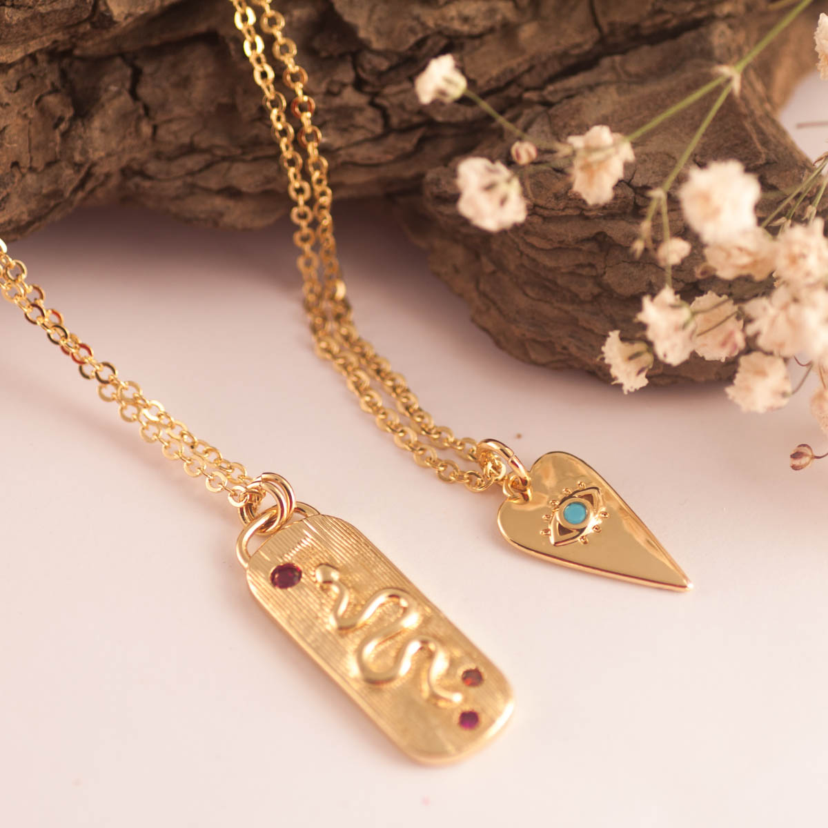 Cadena con un colgante en forma rectangular con una serpiente enroscada grabada, es de latón bañado en oro 18K y tres cristales rojo intenso, cadena de eslabón pequeño de acero inoxidable bañada en oro 18K ( esto es nuevo en el diseño, anteriormente era de latón)