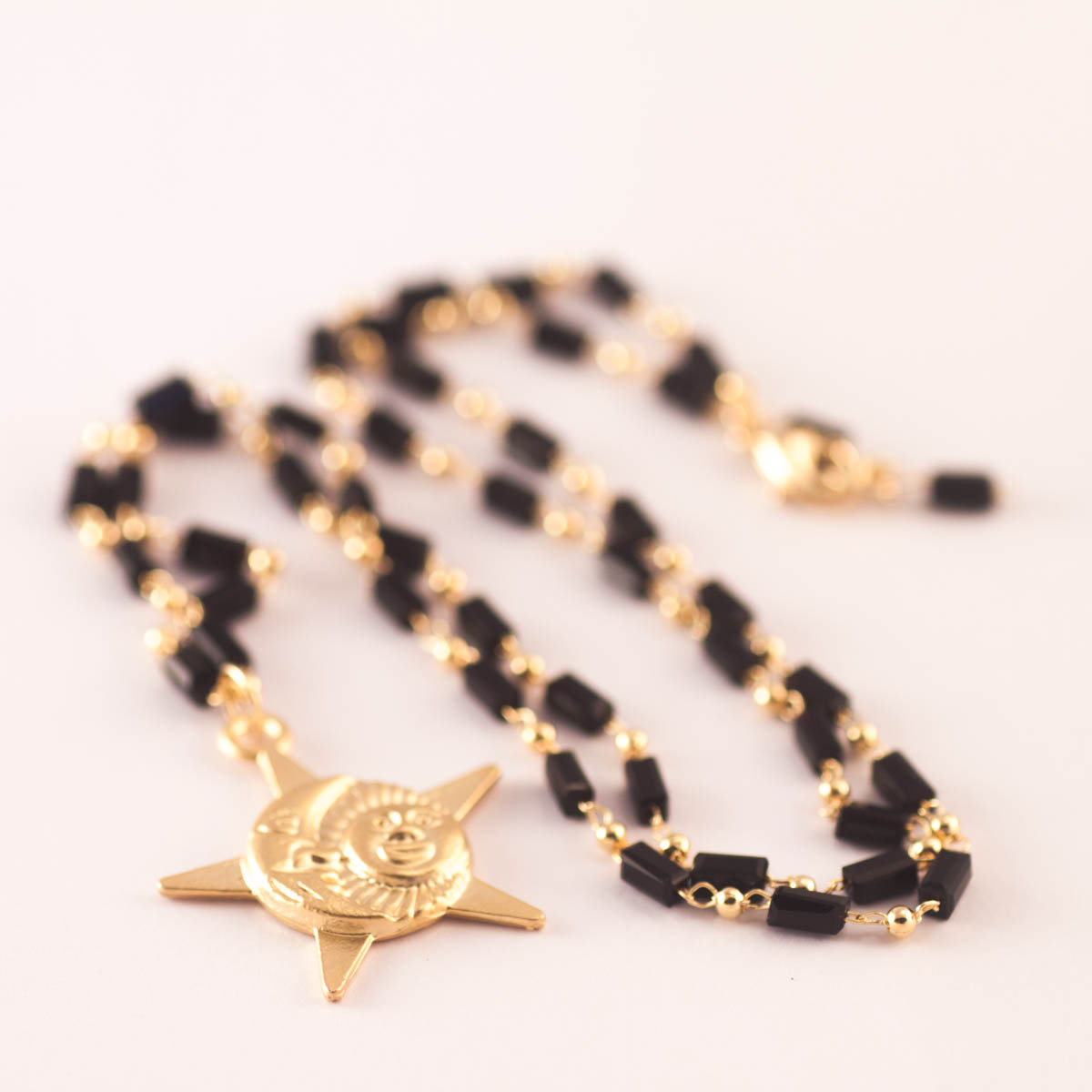 Collar hecho de cuentas de cristal negroy alambre bañado en oro 18K y un colgante de latón bañado en oro mate con el dibujo de un sol y media luna.