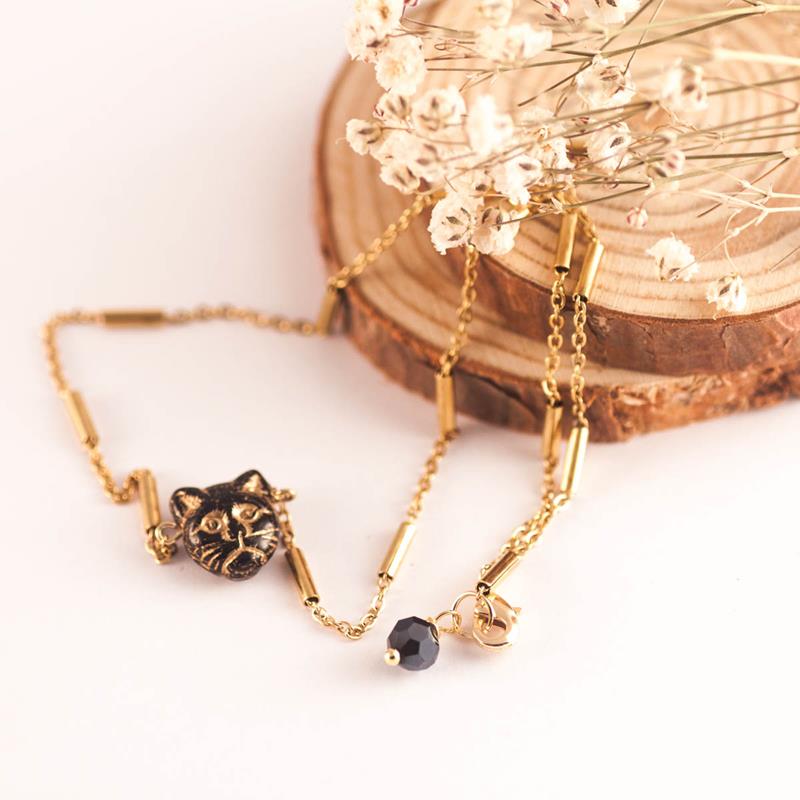 Collar hecho con un colgante de gato en cristal checo, y cadena de pequeños eslabones en acero inoxidable bañado en oro 18K