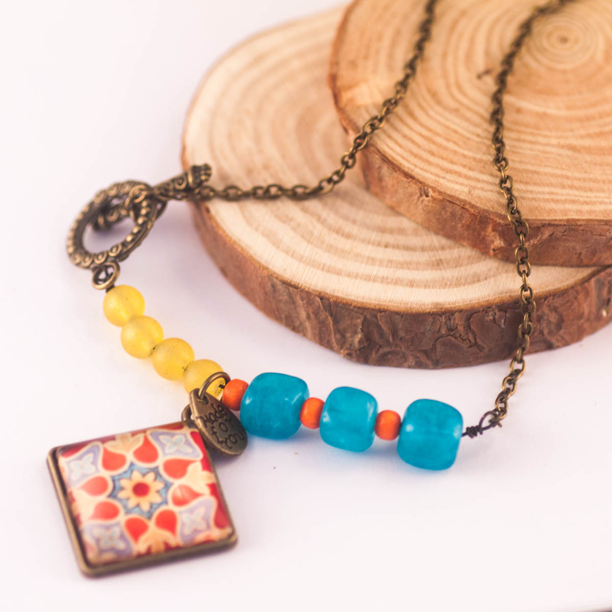 Collar hecho con una pieza central de cristal sobre un dibujo y sobre una base cuadrada de latón en color bronce, Calcedonia teñida en azul y amarillo y cadena en color bronce