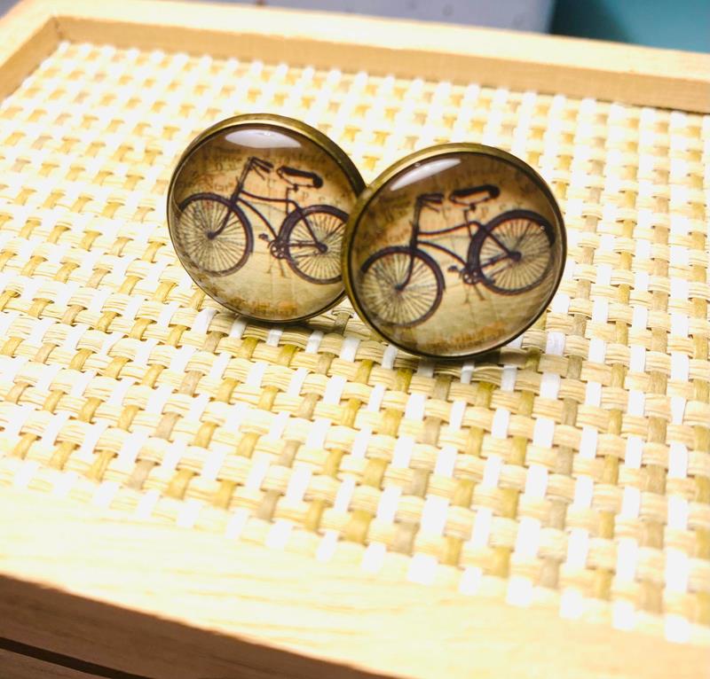 Súper originales gemelos con el dibujo de una bicicleta antigua bajo la esfera de un cristal, muy étnicos.