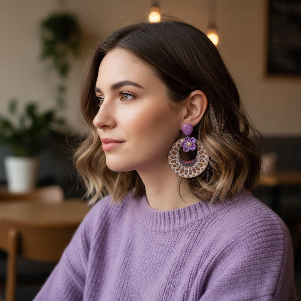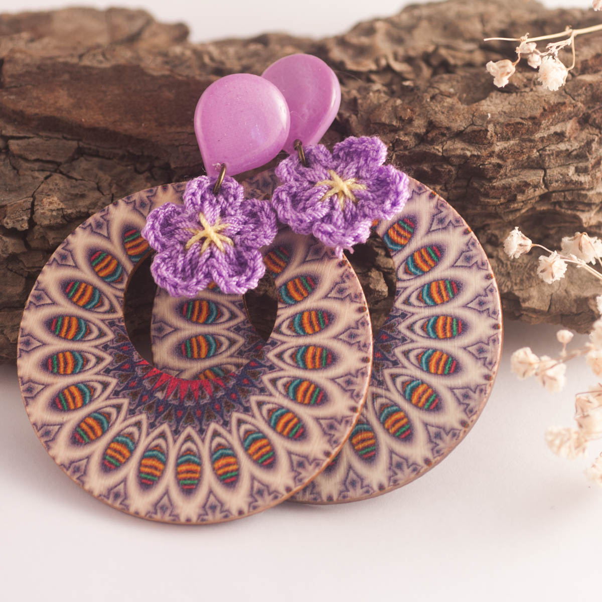 Par de pendientes artesanales, hechos con una pieza central de madera con dibujos étnicos, una flor de ganchillo morada y cierre hecho con impresora 3D y resina encima.