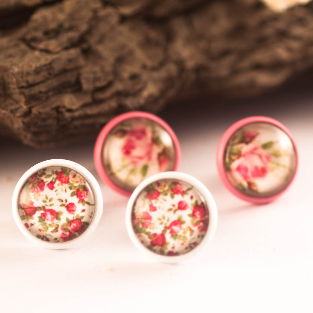 Set de dos pares de pendientes de botón con un dibujo de rosas, con una base en blanco y otra rosa chicle. Son de cristal sobre base de latón pintada.