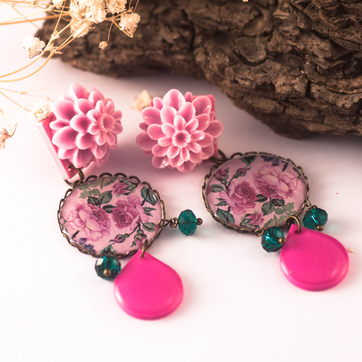 Pendientes largos pero muy ligeros de peso, hechos con Imprensión 3D y resina encima, un precioso dibujo de unas flores y resina encima sobre una base en color bronce, y lágrimas hechas en 3d y cristales facetados verdes. Ten en cuenta que este producto está hecho artesanalmente.