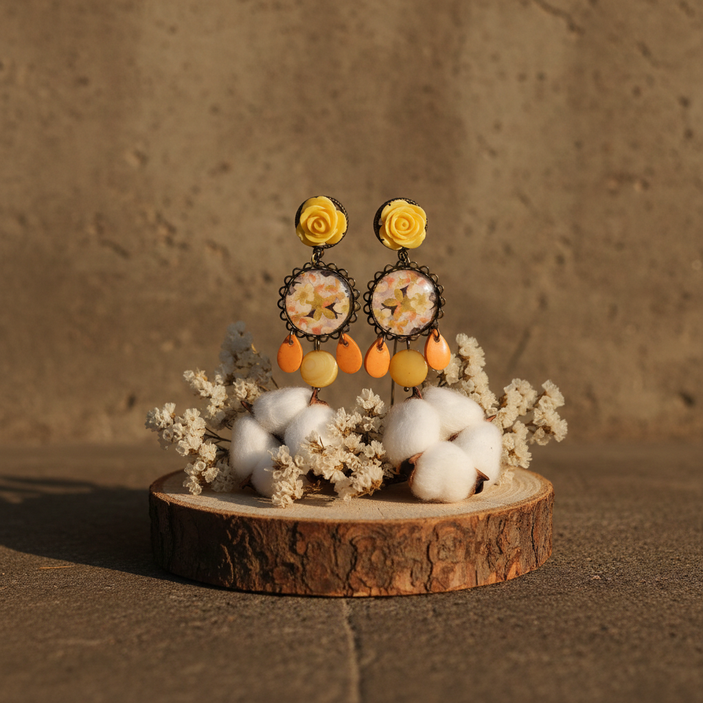 Pendientes largos de tuerca, muy andaluces, son muy lígeros ya que el material pesa muy poco, hechos con Imprensión 3D y resina encima, una rosa de resina, un precioso dibujo de unas flores y resina encima y lágrimas hechas en 3d amarillas y una cuenta de nácar teñida en amarillo. Ten en cuenta que este producto está hecho artesanalmente, no hay dos iguales