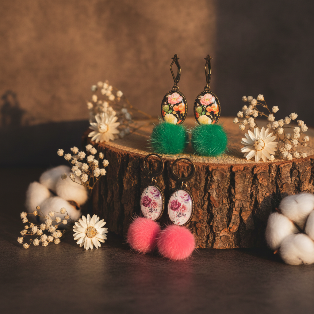 PAR DE PENDIENTES, ELIGE VERDE O ROSA, hechos de cristal, sobre una base bronce y un pompón muy ligero.