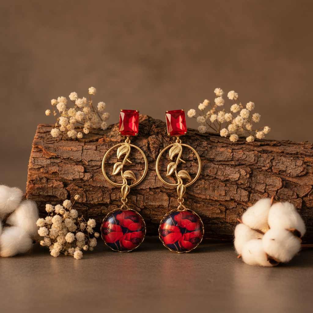 Pendientes con un precioso dibujo de amapolas y un cristal encima sobre una base de latón bañada en oro 24K, un conector con forma de rama y un cierre con un cristal rojo , todo en latón bañado en 24K
