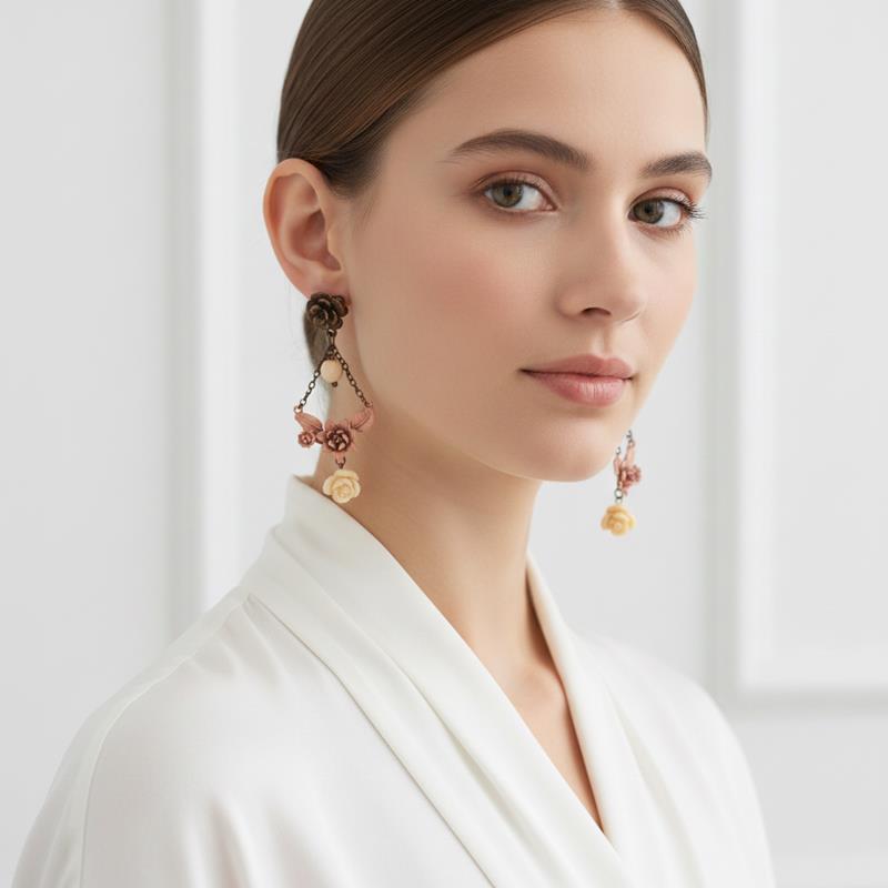 Pendientes de estilo Vintage con un cierre de una rosa en color bronce, filigrana pintada en rosa, cuenta pequeña de cristal y rosa blanco roto hecha con resina
