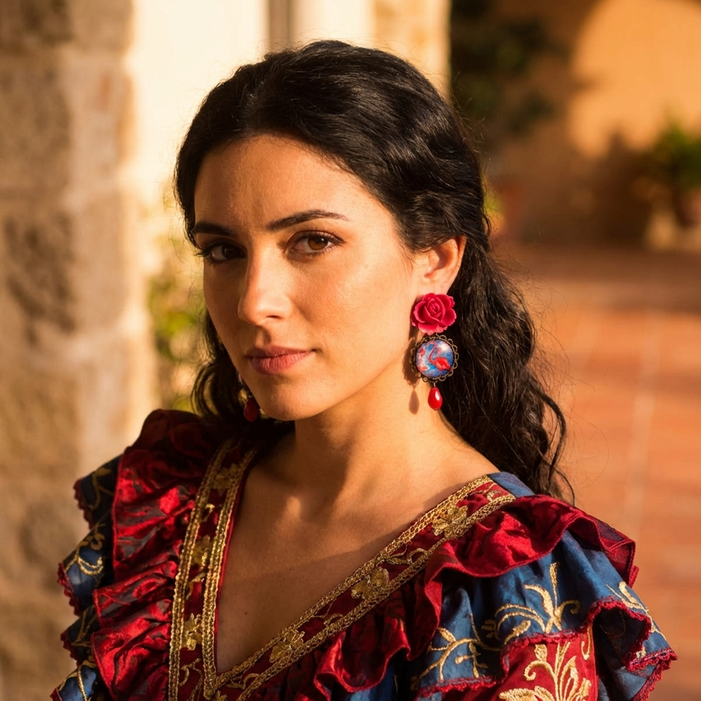 Pendientes largos de tuerca, muy andaluces, hechos con una rosa de resina, un precioso dibujo de un flamenco y una cuenta de cristal facetado.