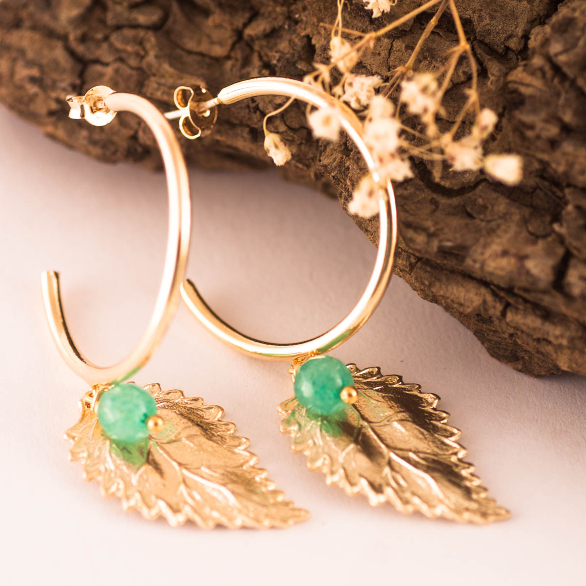 Pendientes de Aro, cierre en Plata de Ley (solo la parte trasera del cierre), de metal bañados en oro 18K, con unas preciosas hojas en metal bañadas en oro y una pequeña piedra de Calcedonia. Son sumamente ligeros lo que hace que sean una pieza realmente cómoda para cualquier ocasión.