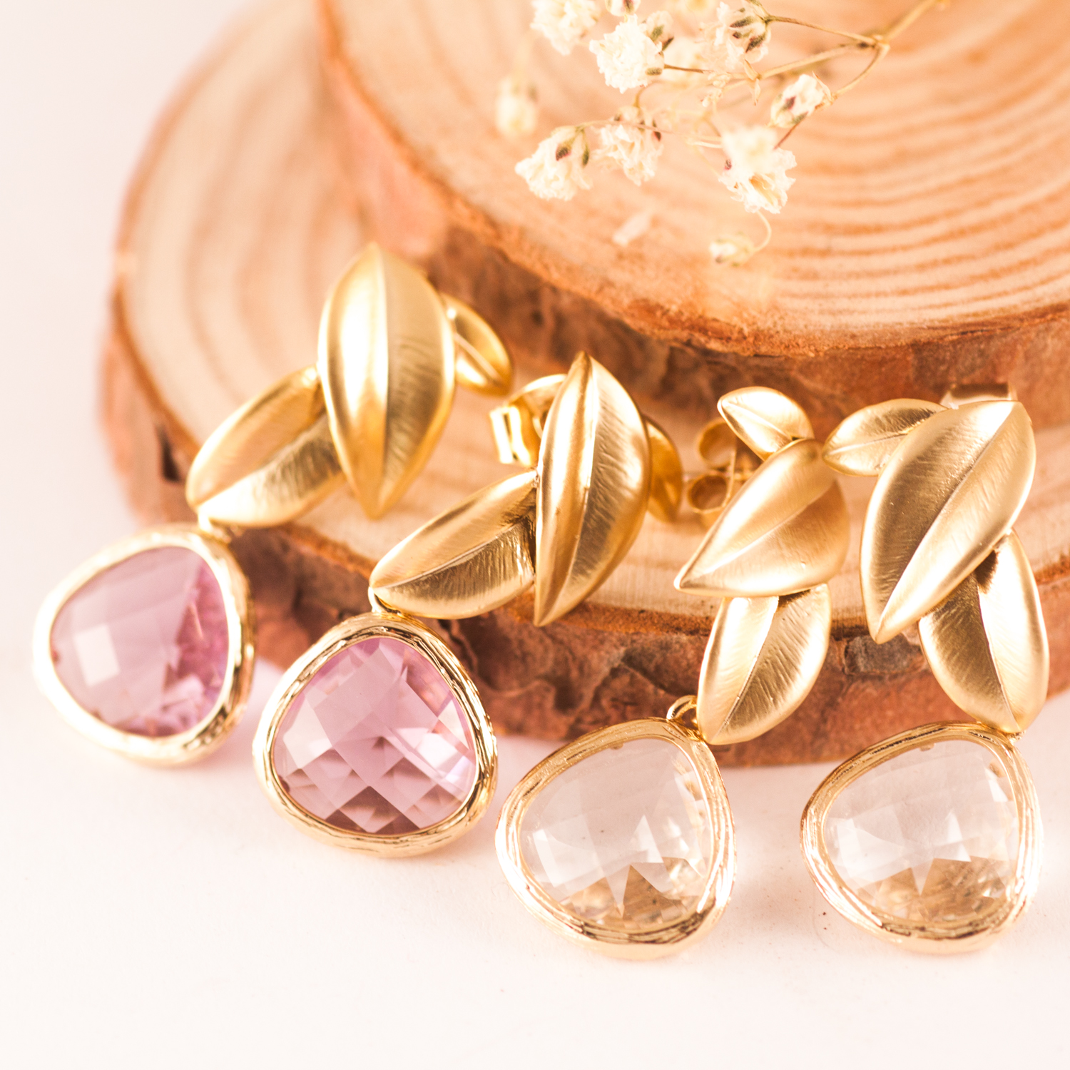 Preciosos pendientes hechos con una base en metal bañada en oro 22K con tres hojas verticales, cierre en Plata de Ley 925, y colgante de gran calidad a tu elección entre morado o cristal natural. Son finos pero a la vez llamativos y con clase.