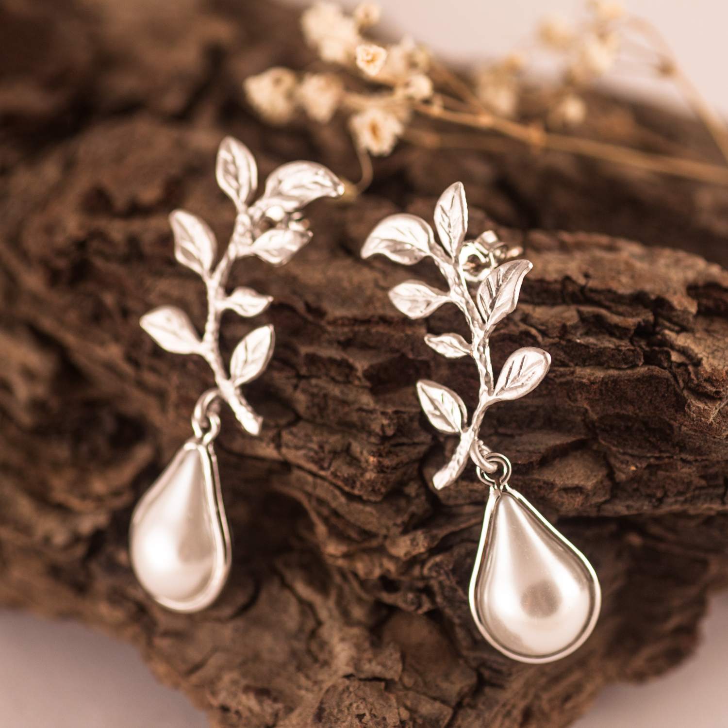 Preciosos pendientes, que se componen de una rama de Laurel en latón bañada en Plata Mate, cierre por detrás en Plata de Ley y una falsa piedra de alta calidad bordeada en plata.