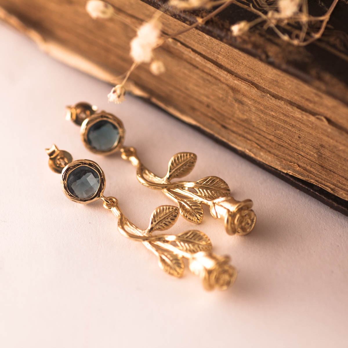Pendientes muy delicados, ideales para un evento romántico, constan de un cierre de Plata de Ley (925), con un cristal facetado de alta calidad en color azul y una rosa bañada de metal bañada en oro mate 18K.