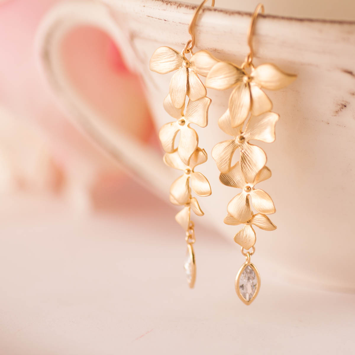 Son unos pendientes Largos, constan de unos ganchos y colgantes de orquídeas de alta calidad bañados en oro mate 18K, tiene un ligero color a bronce lo que le da un aspecto vintage y por último un precioso colgante de cristal facetado Checo.