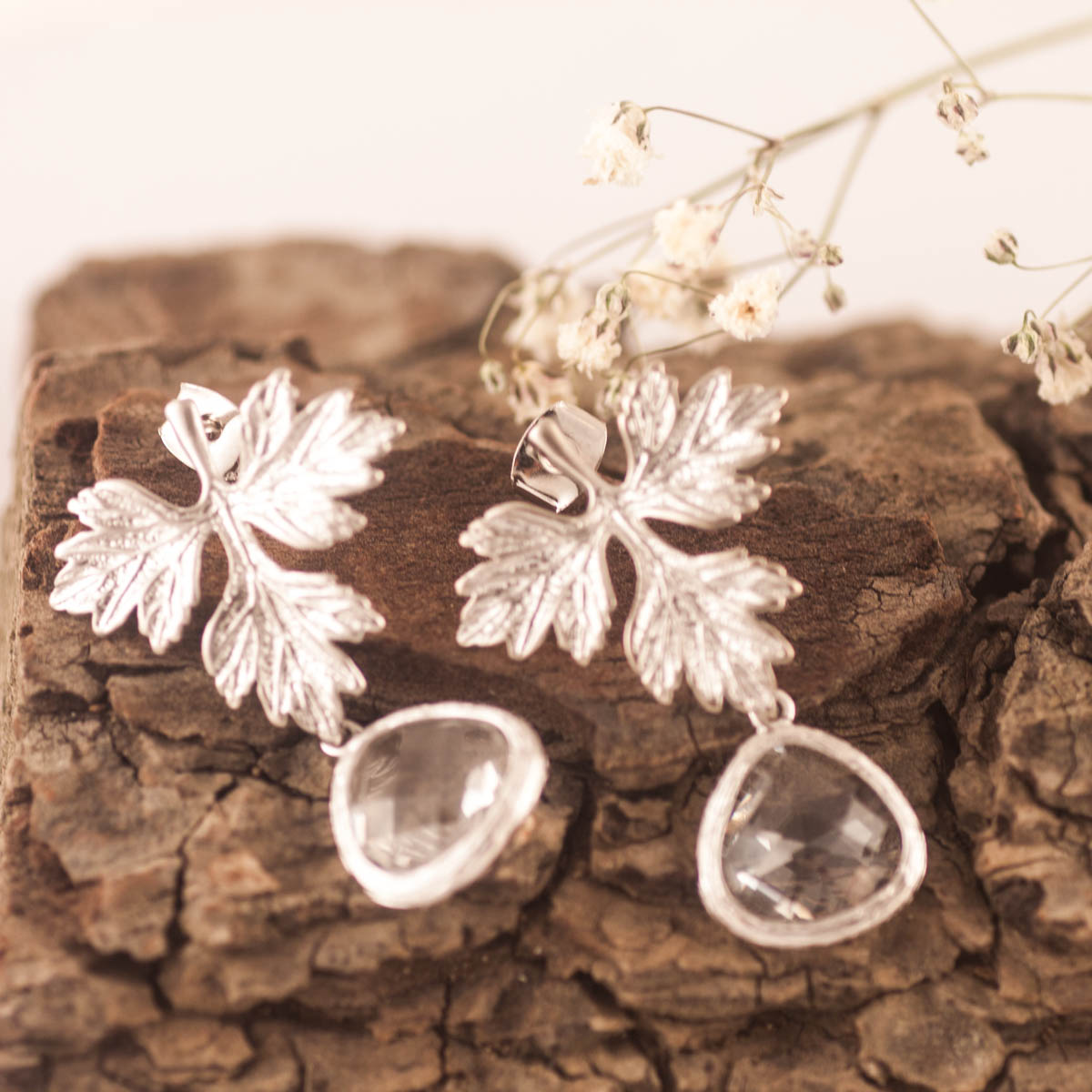 Estos son unos pendientes únicos y delicados, con cierre de tuerca de Plata de Ley 92.5 (solo el cierre), y preciosas hojas en baño de Plata y por último un precioso colgante de cristal facetado Checo con un borde de baño de plata.
