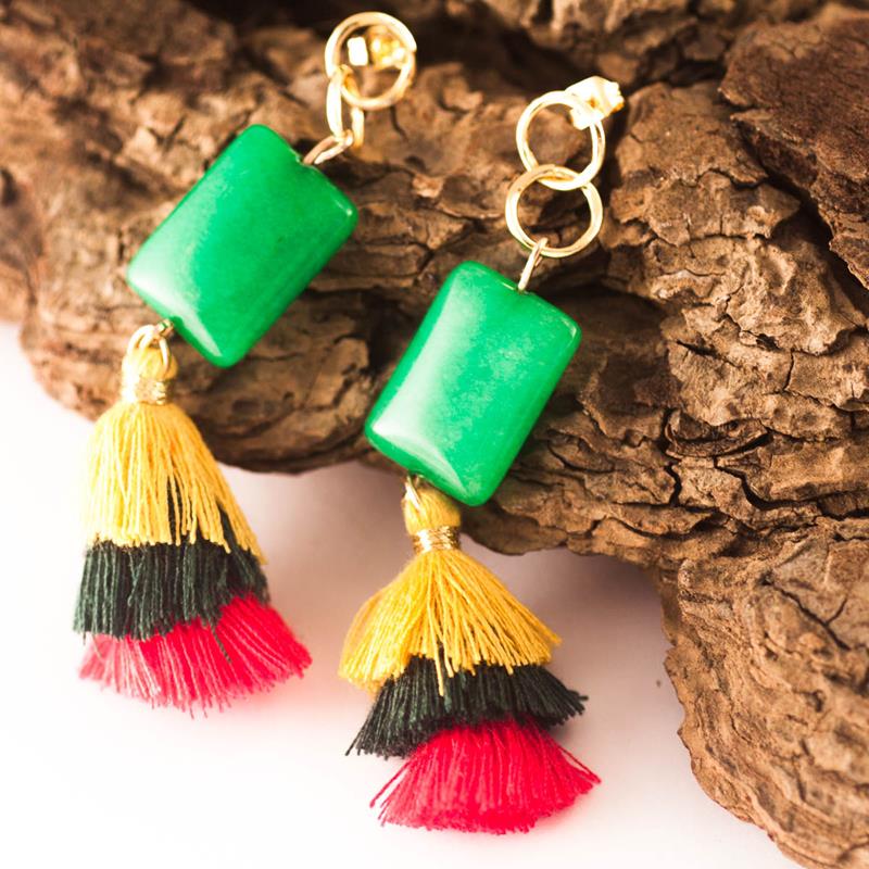 Preciosos pendientes, con una combinación de colores espectacular formados por una borda de algodón en amarillo, verde oscuro y rosa fuerte, una piedra de Calcedonia y cierre tipo tuerca bañado en oro 24K. Se dice que la piedra de Calcedonia aporta Calma, Creatividad y Optimismo.