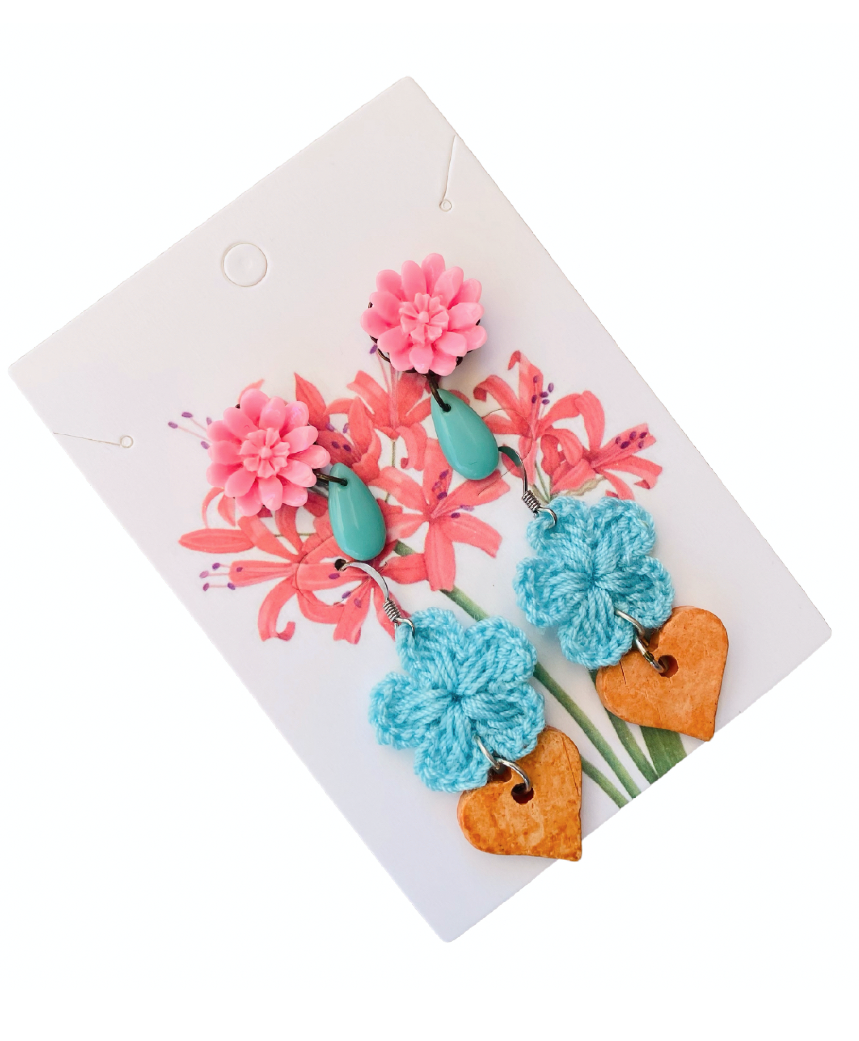 SET de dos pares de pendientes largos, uno hecho con una flor de ganchillo a mano en azul turquesa y corazón de madera, gancho en color plata.