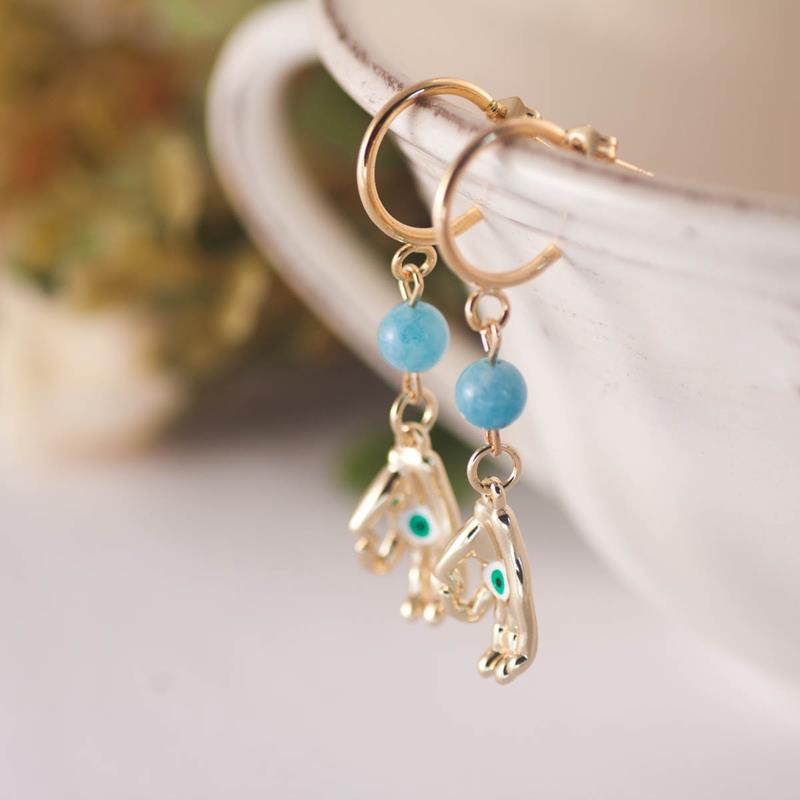Pendientes hechos con un aro pequeño bañado en oro 24K, una Aguamarina y una mano con un ojo Turco bañada en 24K.