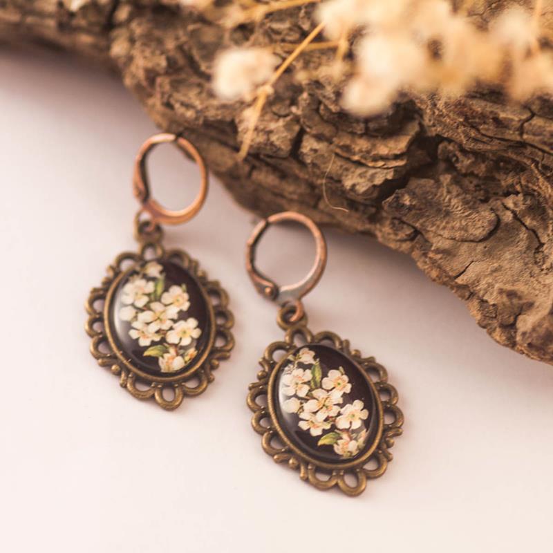 Pendientes de base de latón en color bronce, cierre de seguridad y dibujo de unas preciosas flores con cristal encima para protegerlo.