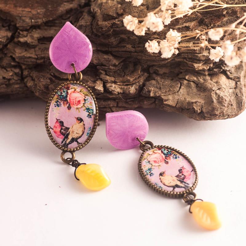 Par de pendientes artesanales, hechos con una pieza central con un dibujo de unos preciosos pajaritos y resina encima, una cuenta de cristal Checo amarillo con forma de hoja y el cierre del pendiente hecho con la impresora 3D