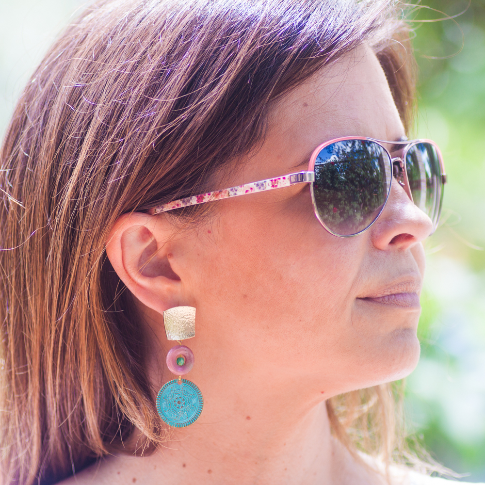 Pendientes de tuerca largos, con base en bronce bañado en oro 24K, y gancho de Plata de Ley ( 925 ) , Rodonita con cristal facetado Checo y moneda de bronce envejecida.