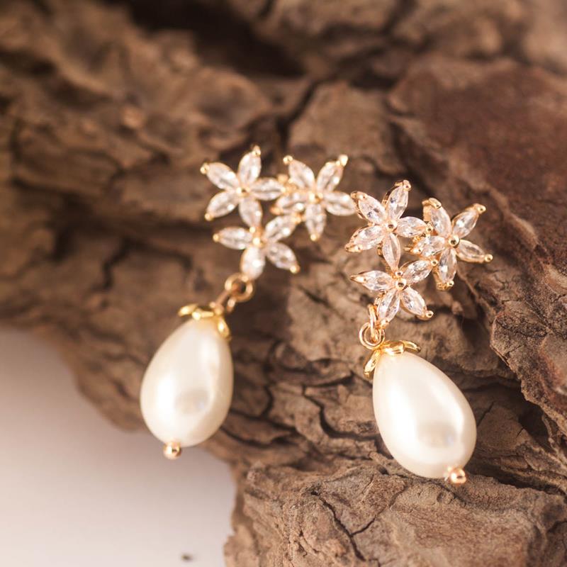 Pendientes de lágrima, hechos con una base de cierre de tuerca con tres flores de brillantes y una lágrima de perla de cristal.