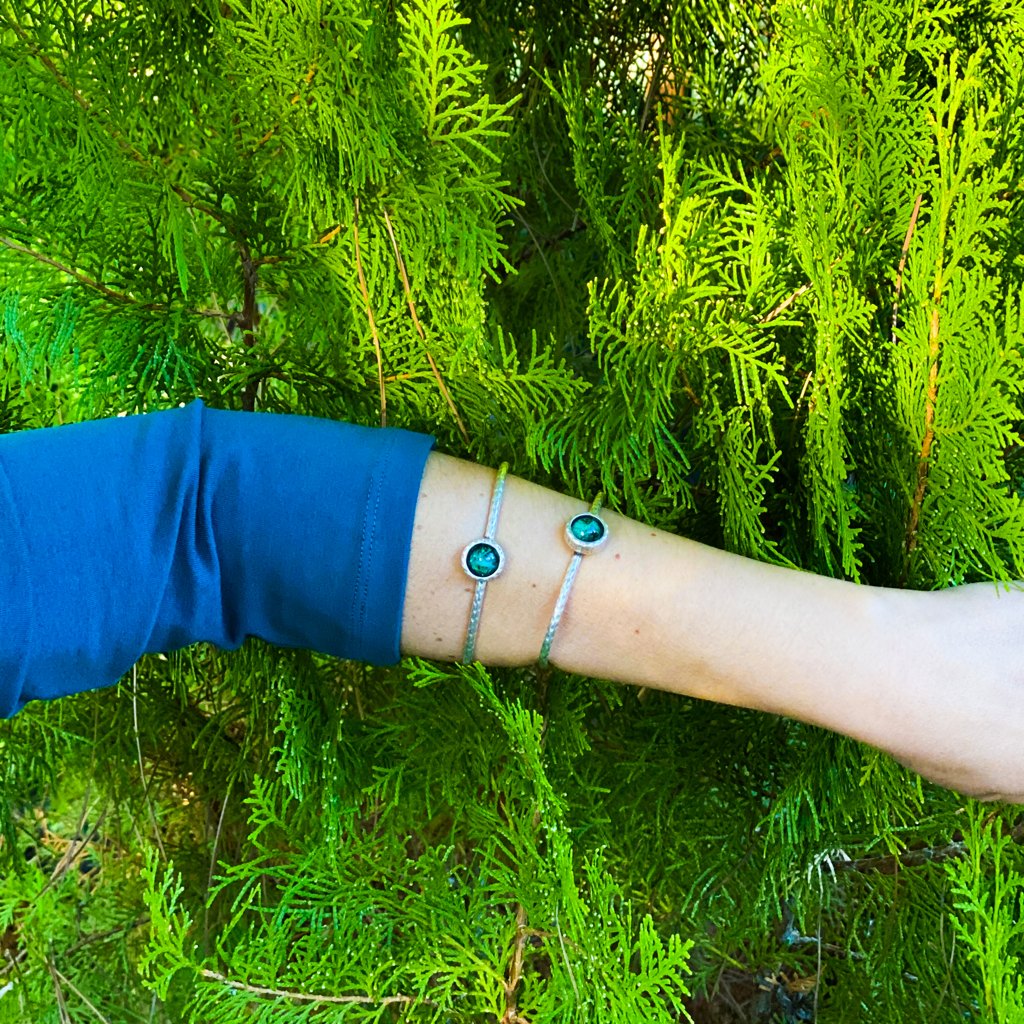 Brazalete ajustable de latón bañado en Plata con una pieza central en color esmeralda de cristal soplado a mano.