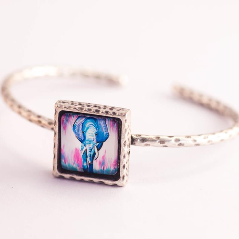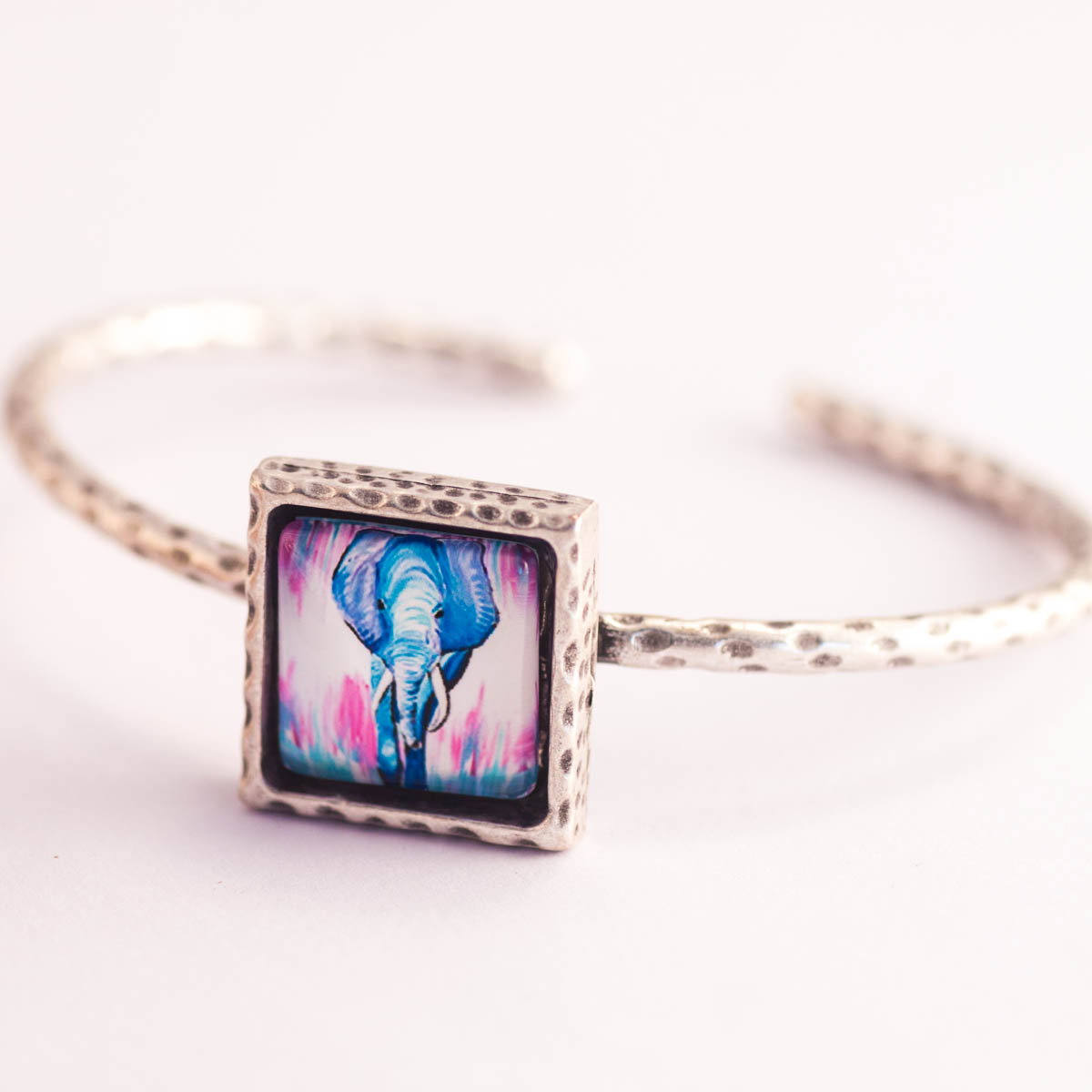 Brazalete ajustable muy originall, de Latón bañado en plata vieja, con un dibujo de un precioso elefante con un cristal encima de 20x20mm