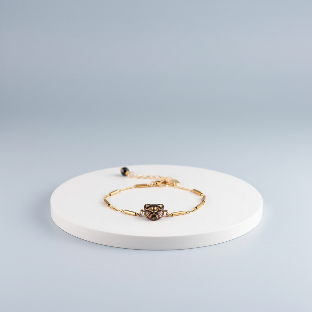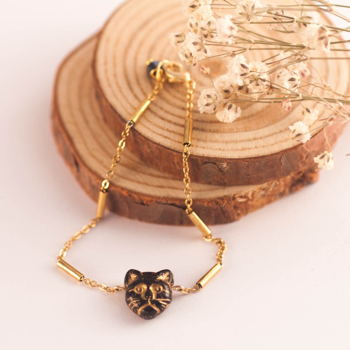 Pulsera hecha con un colgante de gato en cristal checo y cadena de acero inoxidable bañado en oro 18K