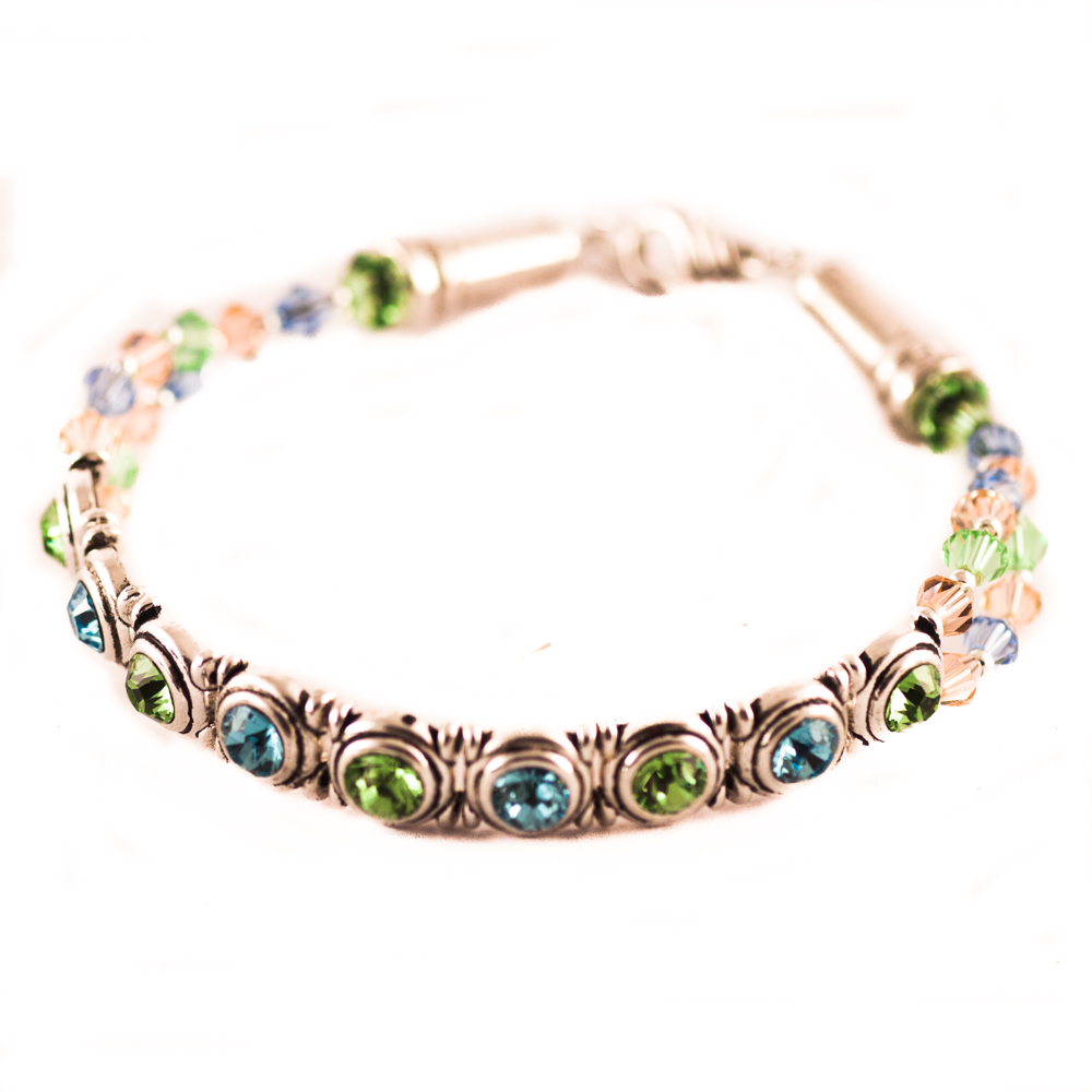 Pulsera hecha con separadores color plata vieja y cristales Swarovski elements en verde y azul aquamarina, cristales checos y cierre bañado en plata.