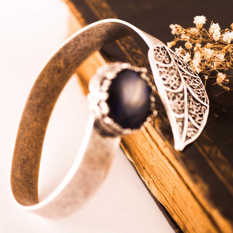 Brazalete de metal color plata con una hoja, totalmente hecho artesanalmente y una piedra de Lapis Lázuli del otro lado, por favor ten en cuenta que es artesanal y no hay dos exactamente iguales. Se afirma que el Lapislázuli proporciona Claridad de mente y elimina el estrés del cuerpo.